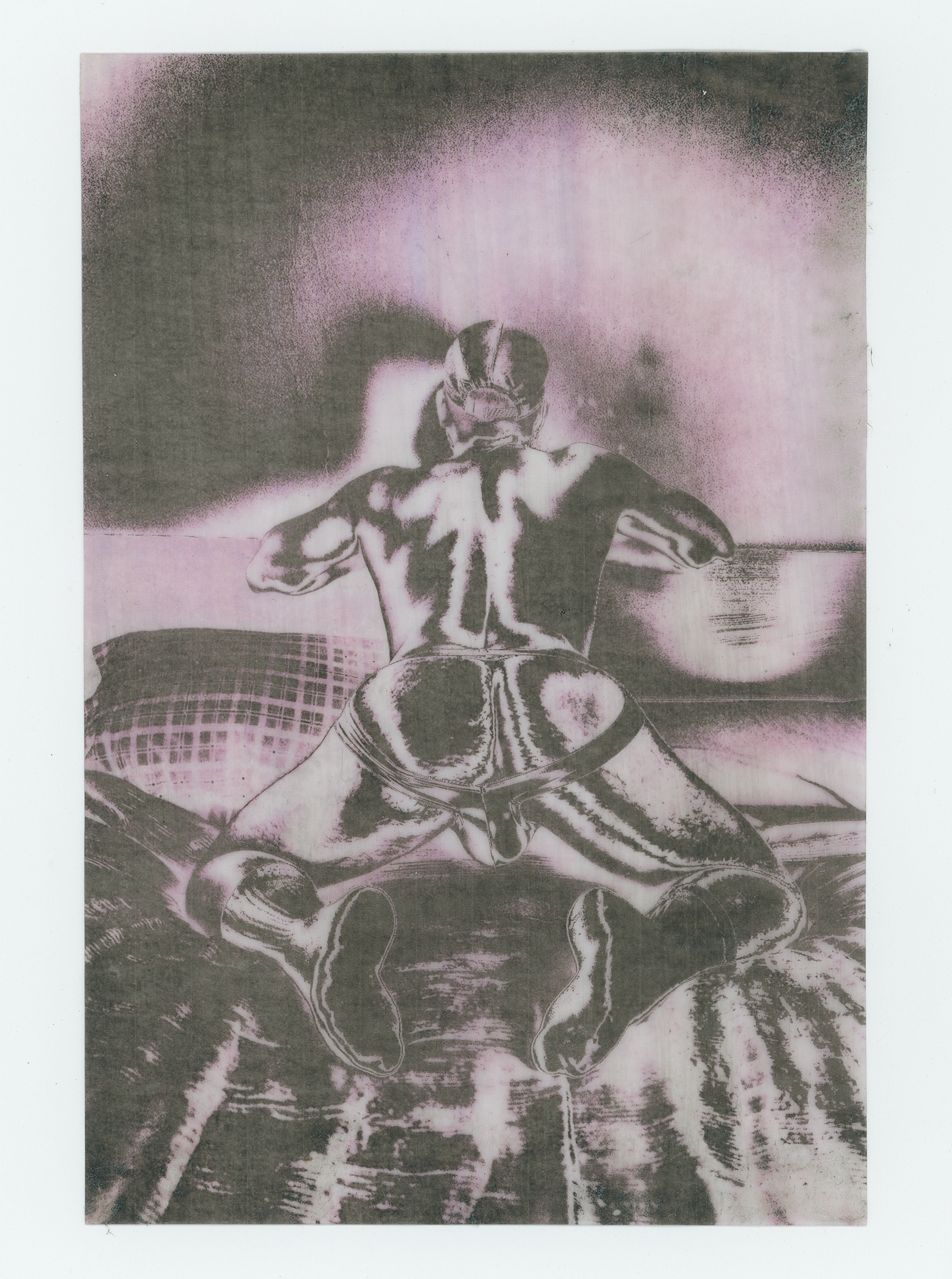 image transfers on aluminum (2025)sex workers and company (2024)digital collages (2022)/untitled_2017 (2017-2021) Previous / Next Image (6 of 7) Ky (Jockstrap), 2024. Acrylic transfer, ink, paper.